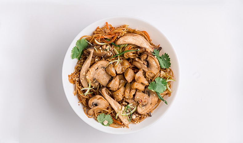 Локшина рисова тонка, яйце смажене, рапани мариновані, гливи, шампіньони, шиїтакі мариновані, цибуля ріпчаста, морква, капуста б/к, кінза, соус на основі рибного, вустричного соусів, крихта кешью та цедра лайма, зелена цибуля, грибна умамі сіль.