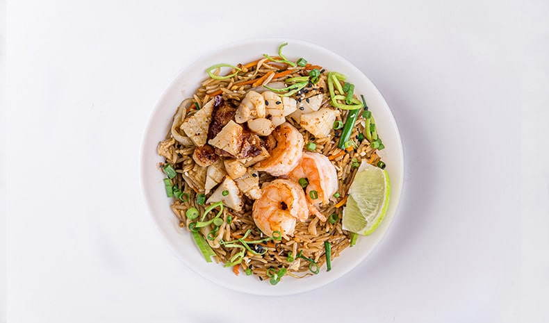 Креветка тигрова, кальмар, гребінець, цибуля ріпчаста, яйце, морква, капуста б/к, цибуля зелена, кокосове молоко, лайм, кунжут та часниково-лимонний соус.