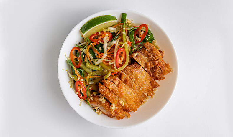 Рис жасмін заправлений соєвим соусом, кунжутною олією та рисовим оцтом, стегно куряче паніроване та обсмажене, салат з капусти, морковки, огірка та бебі шпинату, заправлений соєвим соусом та кунжутною олією, тайський соус, арахіс, чилі, лайм