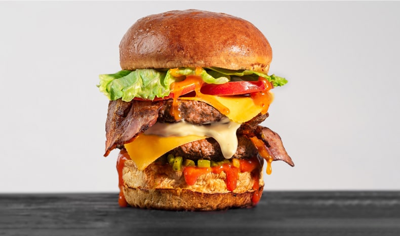 Дві яловичих котлети, подвійний сир, подвійний бекон, цибуля, маринований огірок, томати, айсберг, халапеньйо, медово-гірчичний соус, соус барбекю і соус світ хіккорі.