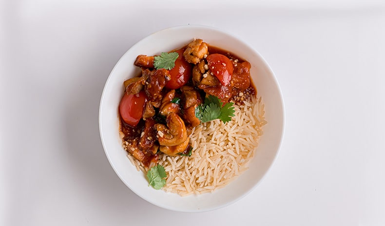 Куряче стегно мариноване в грецькому йогурті зі спеціями, томати чері, кінза. Подається на паровому рисі з соусом на томатній основі з додаванням спецій. вершків та соєвого соусу, посипається крихтами фундуку.