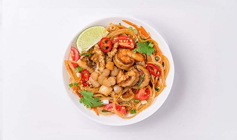 Креветка тигрова, кальмар, гребінець, цибуля ріпчаста, яйце, морква, чері, кінза, перець чилі, гриби, цибуля зелена, кокосове молоко, лайм, кунжут та соус том ям соус.