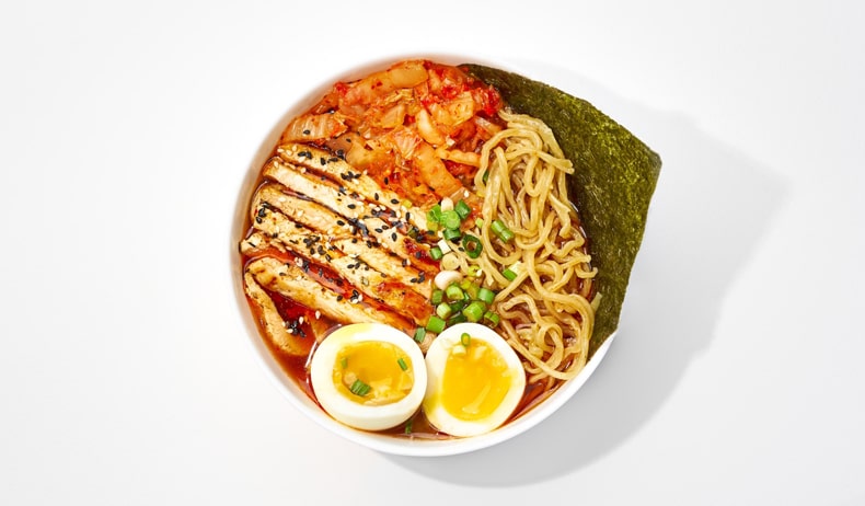 Курячий бульйон, соус Табаджан, кунжутна олія, кімчі, куряче філе, локшина, яйце, зелена цибуля, кунжут, норі.