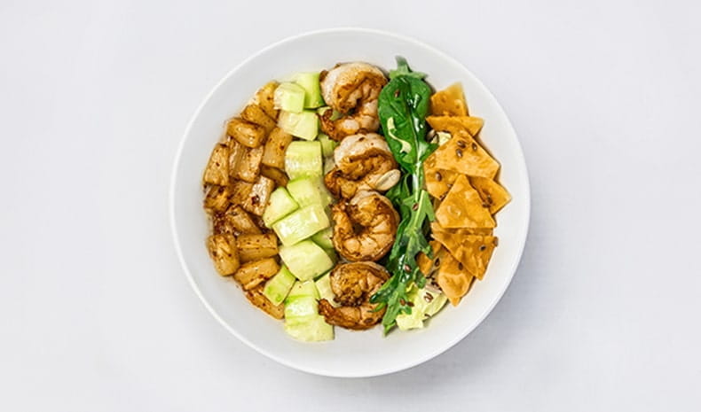 Тигрова креветка обсмажена в кокосовому молоці з часником, кукурудзяна тортілья, ананас гриль, оригінальний тайський соус на основі лайма, свіжий огірок, мікс айсберга, шпинату й руколи, кунжут, мікс насіння, рис жасмін, заправлений кунжутною олією, соєвим соусом та рисовим оцтом з цукром